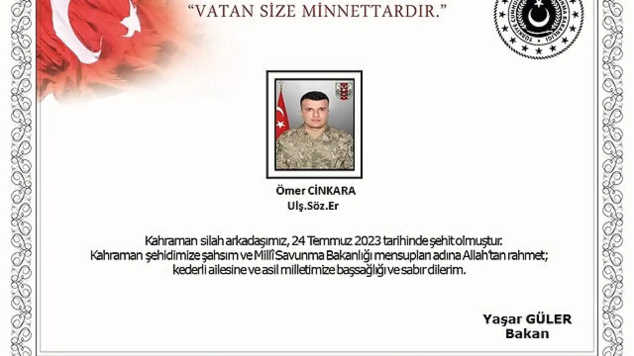 Milli Savunma Bakanlığı’ndan yapılan açıklamada, “Özalp/Van´da 24 Temmuz 2023 tarihinde silah kazası sonucu yaralanarak derhal hastaneye sevk edilen kahraman silah arkadaşımız Ulş.Söz.Er Ömer CİNKARA yapılan tüm müdahalelere rağmen kurtarılamayarak şehit olmuştur” denildi.