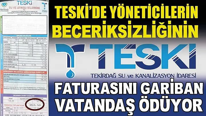 Tekirdağ Büyükşehir Belediyesi'nin yüksek su faturası vatandaşları isyan ettirdi.TESKİ, su tüketiminde kademeli sistem üzerinden yapılan faturalandırma da su sayaçlarını geç okuyarak vatandaşlara yüksek kademeden ücretlendirme uygulamasından dolayı vatandaşların su faturası katlamalı olarak yüksek geliyor.