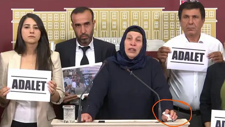 'Adalet için Ankara'dayız. Ailemiz hakkında ortaya atılan bütün iftiraları, somut deliller ve resmi evraklarla boşa çıkardık' diyen Şenyaşar Ailesinden anne Emine Şenyaşar, saldırı sonrasında eline aldığı beyaz mendili Meclis kürsüsünde de avuçlarının arasındaydı.