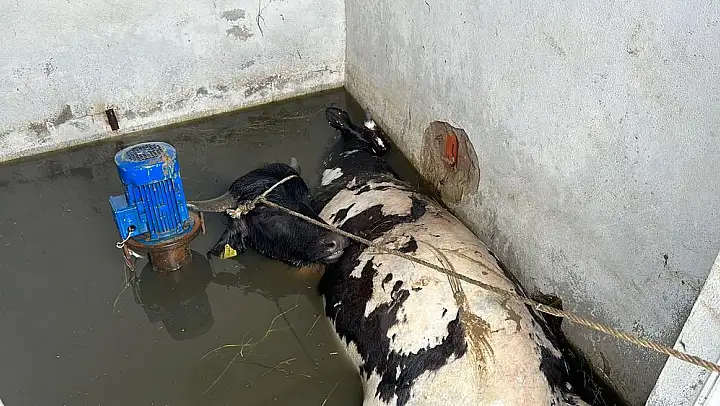 Yaklaşık 45 dakikalık çalışmanın ardından canlı inek vinç yardımıyla su kuyusunun içerisinden çıkarıldı.