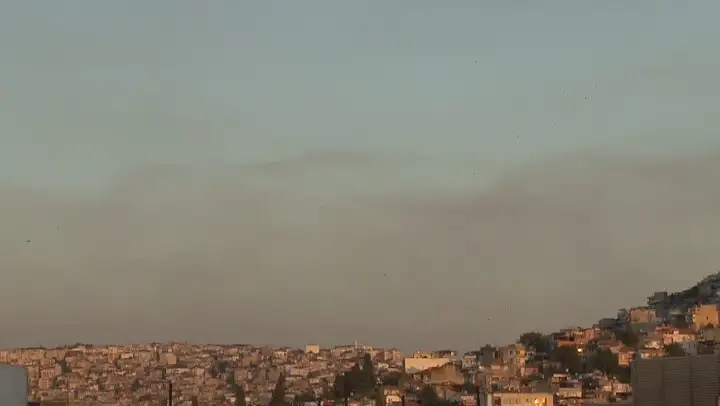 Manisa Saruhanlı'da çıkan orman yangınını söndürme çalışmalarından yükselen dumanlar İzmir'den de görülüyor Saruhanlı ilçesi Hatıplar Mahallesi...