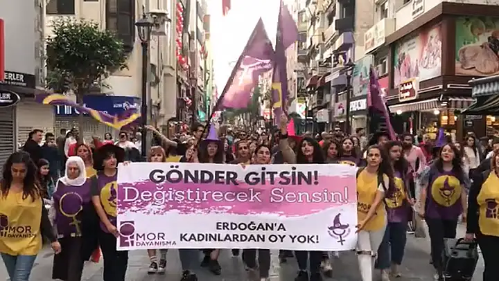 İkinci turda Cumhurbaşkanlığı seçiminde Erdoğan'ın rakibi Millet İttifakı Cumhurbaşkanı adayı Kemal Kılıçdaroğlu'ndan yana tercih edilmesi gerektiğini de isim vermeden belirten İzmir Mor Dayanışma, 'Yeniden Refah Partisi, Hizbullahçı HÜDA-PAR gibi partileri meclise taşıyarak kadın düşmanlığını pekiştiren AKP-MHP iktidarına kaybettireceğiz!' denildi.