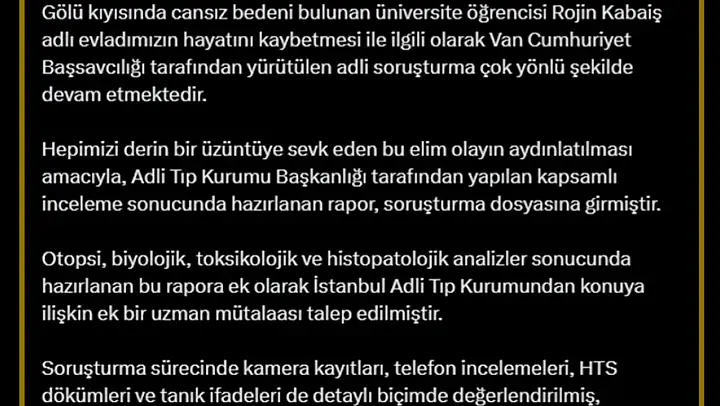 Van'da 27 Eylül 2024'te kaybolan ve 15 Ekim 2024'te Van Gölü kıyısında ölü bulunan üniversite öğrencisi Rojin Kabaiş ile ilgili soruşturma devam ediyor. Adalet Bakanı Yılmaz Tunç, olayın aydınlatılması için soruşturmanın titizlikle yürütüldüğünü belirterek, Adli Tıp Kurumu raporuna ilişkin açıklamalarda bulundu.