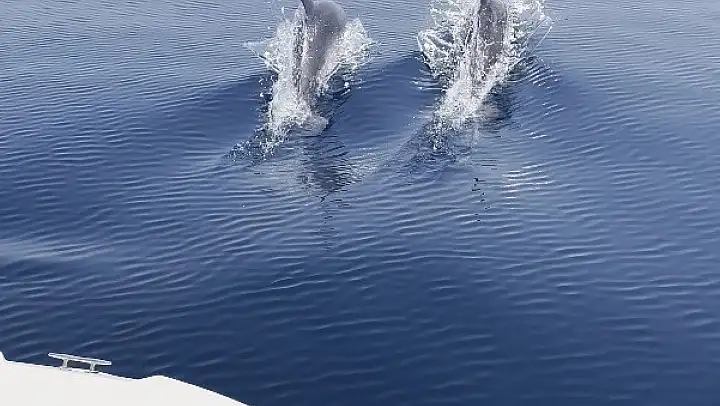 Çanakkale'de Saros Körfezi'nde yaklaşık 5 metre uzunluğundaki 'Kanca' isimli teknesiyle denize açılan, hobi olarak balıkçılık ve fotoğrafçılık yapan Ertuğrul Birel'e, denizde 3 yunus eşlik etti.