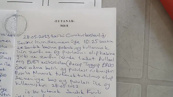 İzmir Konak'ta 2146 nolu sandıkta oy kullanmak için zarf, oy pusulası ve mührü alarak oy kabinine giren vatandaş zarfın içinde Cumhurbaşkanı Erdoğan'a 'EVET' mührü basılmış bir oy pusulası buldu.