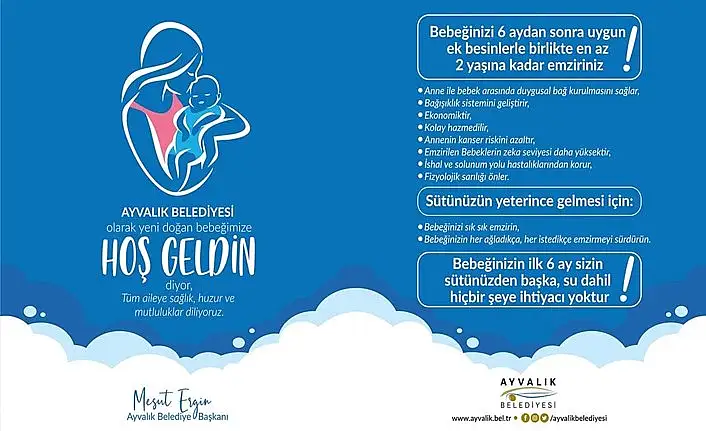 Ayvalık Belediye Başkanı Mesut Ergin tarafından başlatılan “Hoş Geldin Bebek” projesi çerçevesinde yeni doğan bebeklerin ailelerine anne ve bebeğin ilk bakım gereksinimleri armağan ediliyor. Sosyal sorumluluk anlayışı kapsamında yapılan projeyle; ailelerin ekonomisine sağlanan desteğin yanı sıra doğum sonrası acil ihtiyaçların da karşılanması hedefleniyor. Proje kapsamında gelir türü gözetmeksizin, başvuru yapan her ailenin evine konuk olunuyor.