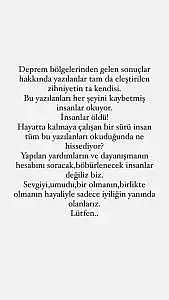 “Deprem bölgelerinden gelen sonuçlar hakkında yazılanlar tam da eleştirilen zihniyetin ta kendisi. Bu yazılanları her şeyini kaybetmiş insanlar okuyor. İnsanlar öldü! Hayatta kalmaya çalışan bir sürü insan tüm bu yazılanları okuduğunda ne hissediyor? Yapılan yardımların ve dayanışmanın hesabını soracak, böbürlenecek insanlar değiliz biz. Sevgiyi, umudu, bir olmanın, birlikte olmanın hayaliyle sadece iyiliği yanında olanlarız. Lütfen…”