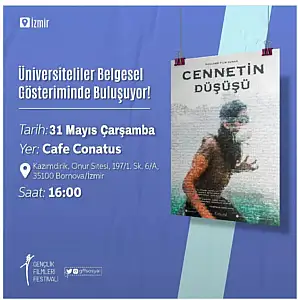 İzmir’de Gençlik Filmleri Festivali’nin düzenlediği ‘Üniversiteliler Belgesel Gösteriminde Buluşuyor!’ isimli konuda buluşan izleyiciler; Conatus Cafe’de ‘Cennetin Düşüşü’ adlı direniş sembolünü andıran filmi izlemeye hazırlanıyor.