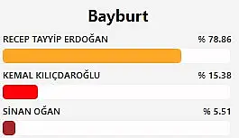 2023 Cumhurbaşkanlığı seçimlerinde sandıkların yüzde 99’u açılırken; Cumhurbaşkanı Erdoğan’ın oy oranı yüzde 49.37, Kemal Kılıçdaroğlu‘nun oy oranı yüzde 44.99, Sinan Oğan’ın oy oranı ise yüzde 5.21 olarak görüldü. Erdoğan seçimde en yüksek oyu yüzde 78.86 ile Bayburt’tan aldı. Cumhurbaşkanı’nın memleketi Rize’den aldığı oy oranı ise yüzde 72.79 oldu.