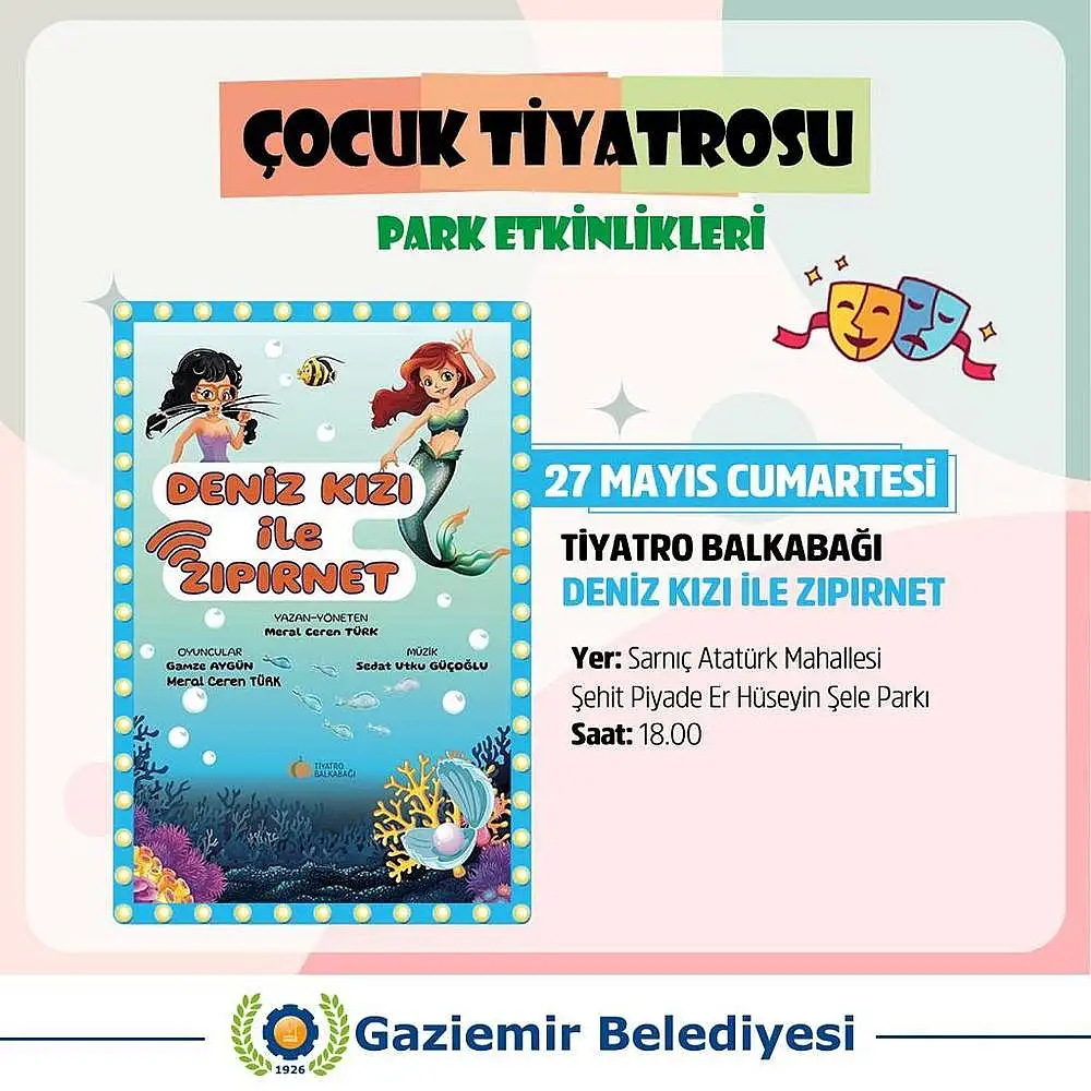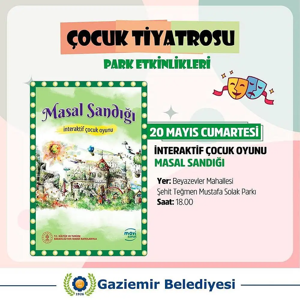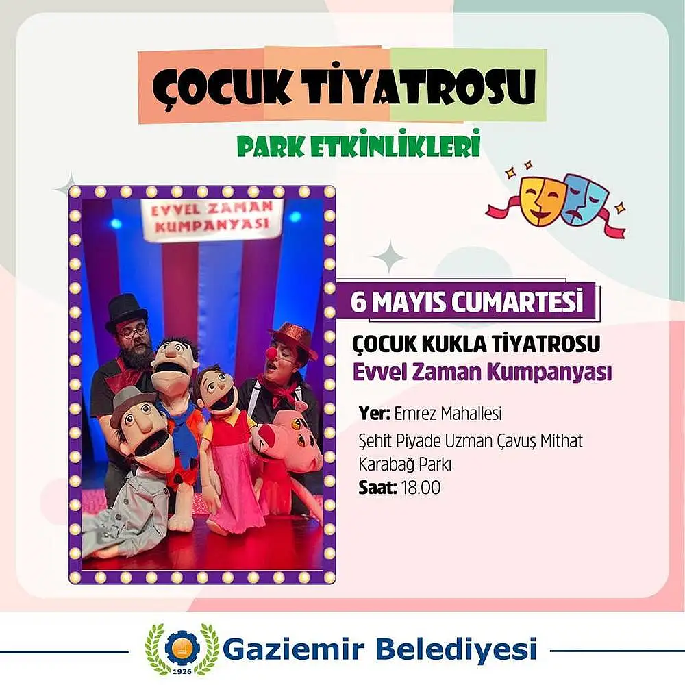 Emrez Mahallesi’ndeki Şehit Piyade Uzman Çavuş Mithat Karabağ Parkı’nda, 6 Mayıs Cumartesi günü Evvel Zaman Kumpanyası oyunu gerçekleştirilecek. Masal Sandığı oyunu, 20 Mayıs Cumartesi günü Beyazevler Mahallesi’ndeki Şehit Teğmen Mustafa Solak Parkı’nda minik izleyicilerle buluşacak. Tiyatro Balkabağı, 27 Mayıs Cumartesi günü Sarnıç’taki Şehit Er Hüseyin Şele Parkı’nda, Denizkızı ile Zıpırnet oyununu Gaziemirli minik seyirciler için sahneleyecek.