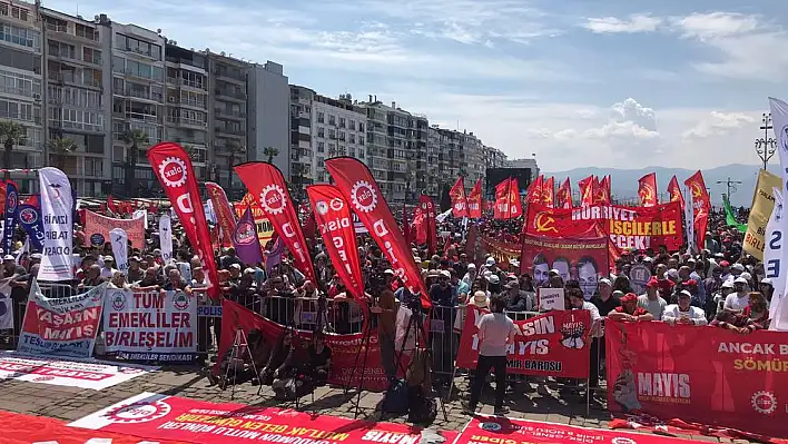 1 Mayıs için hazırlanan ortak metni ise DİSK Ege Bölge Temsilcisi Memiş Sarı okudu. Kahramanmaraş merkezli meydana gelen depremleri hatırlatan Sarı, “Doğal bir felaketin insan eliyle son birkaç yüzyılın en büyük trajedilerinden birine dönüşmesine neden olanlar, göstermelik açıklamalarla, birkaç tutuklamayla kendilerini işin içinden sıyıramayacaklar. Ant olsun ki, yaşamını yitiren her bir canlının, denetimsizliğin, rant politikalarının yol açtığı yıkımların er ya da geç hesabını soracağız! Her gün yaptıkları sahte açılış törenleriyle, doğalgaz aldatmacasıyla, savaş silahlarını sahneledikleri gösterileriyle bizlere depremin acısını unutturamayacaklar” ifadelerini kullandı.