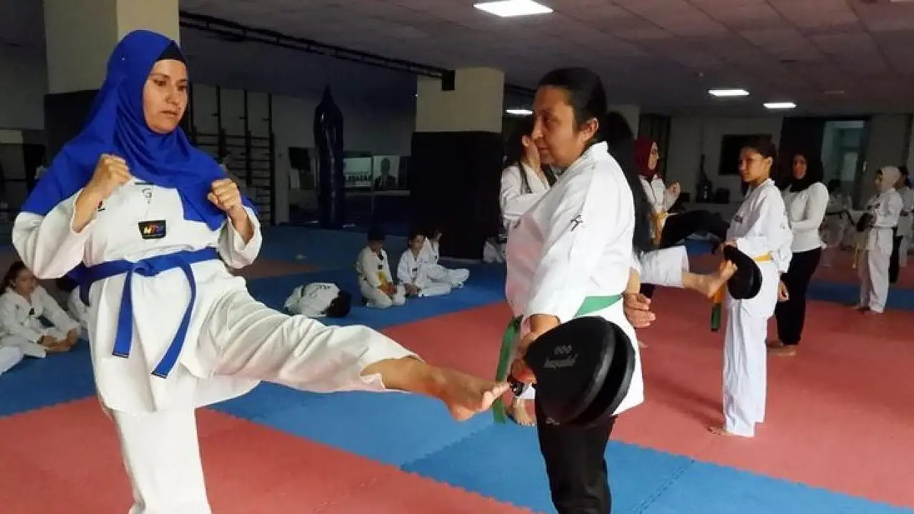 Antalya Kepez Belediyesi Spor Kulübünün tekvando branşında spor yapan 3 aylık hamile Seher Gözükızıl, katıldığı kuşak sınavında spora olan tutkusuyla herkesin takdirini topladı.