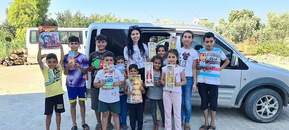 Hatay’da yaşayan depremzede ressam Derya Tatlıcı, afetzede çocuklar yararına çizdiği tabloyu 40 bin TL’ye satarak elde etiği parayla konteyner ve çadır kentlerde yaşayan çocuklara oyuncak dağıttı.