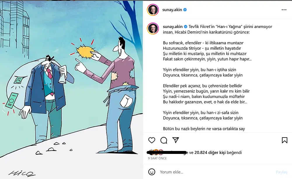 Yazar Akın, “Tevfik Fikret’in “Han-ı Yağma” şiirini anımsıyor insan, Hicabi Demirci’nin karikatürünü görünce” diyerek paylaştığı karikatürün altına “Han-ı Yağma” isimli şiiri ekledi, hesabından paylaştı.