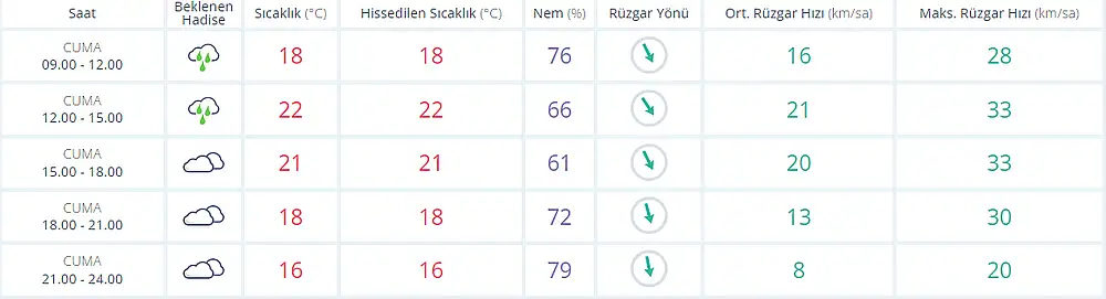 Sıcaklığın en fazla 22 en düşük ise 16 derece olduğu günde hava durumu tahmin raporu ise şöyle,