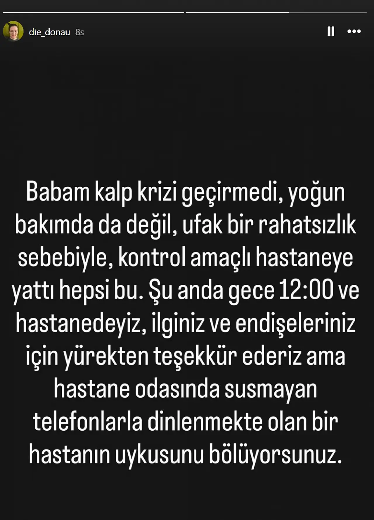 Kızı Tuna Ortaylı da, babasının durumuna ilişkin açıklamasında, “Babam kalp krizi geçirmedi, yoğun bakımda değil. Ufak bir rahatsızlık sebebiyle kontrol amaçlı hastaneye yattı, hepsi bu” dedi.
