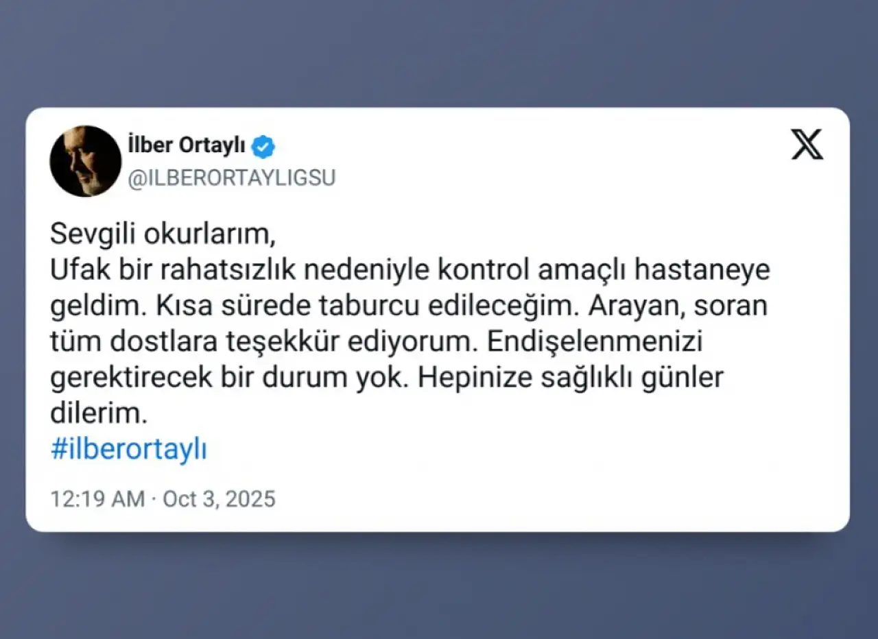Kısa süreli bir rahatsızlık nedeniyle kontrol amacıyla hastaneye geldiğini belirten Ortaylı, sosyal medya hesabından yaptığı açıklamada, “Kısa sürede taburcu olacağım. Arayan, soran dostlara teşekkür ederim. Endişelenmenizi gerektirecek bir durum yok” ifadelerini kullandı.