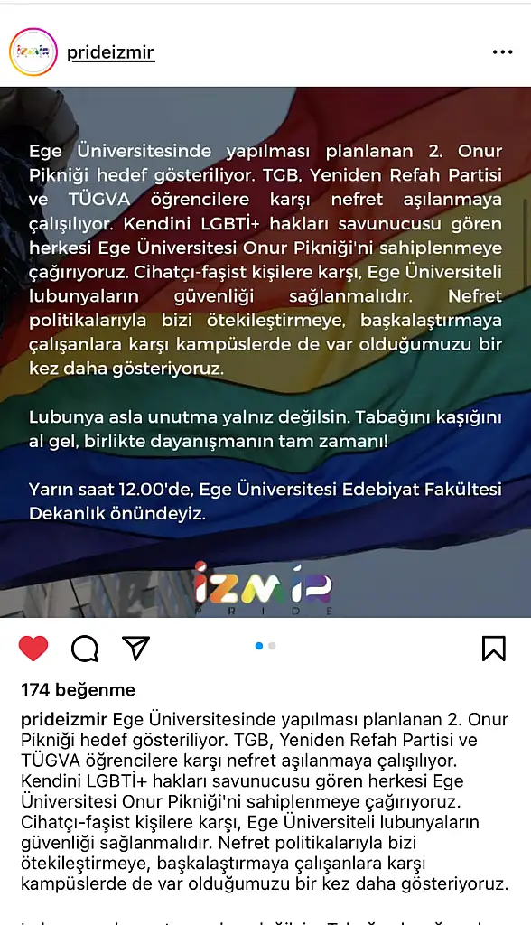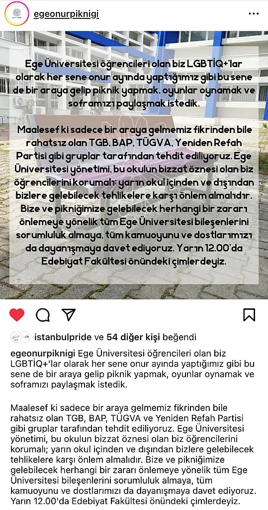 “Ege Üniversitesi öğrencileri, Onur Haftası kapsamında 02.06.2023 tarihinde saat 12.00’de üniversite kampüsünde yapmayı planladıkları ve Ege Üniversiteli LGBTİQ+ların bir araya geleceği “Onur Pikniği” nedeniyle hedef haline getirilirken, etkinlik de engellenmeye çalışılmaktadır. Konuyla ilgili Baro Başkanımızca Emniyet Müdürlüğü ve Ege Üniversitesi Rektörlüğü ile gerekli görüşmeler yapılmış, pikniğin yapılmasının sağlanması için gerekli önlemlerin alınması talep edilmiştir.