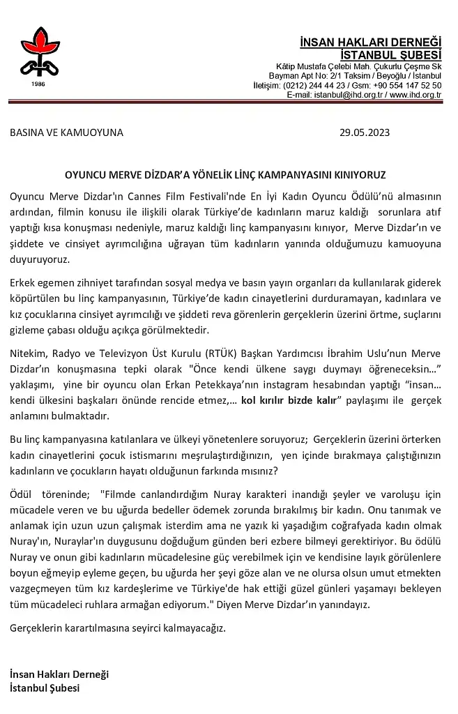 Cannes Film Festivali’nden ödül alan oyuncu Merve Dizdar, Türkiye’de kadınların yaşadığı acı trajediyi ve maruz kaldığı sorunlara değinen açıklamalar yapmıştı. Bunun üzerine linçlenen Dizdar’a İHD’nin desteği gecikmedi.