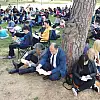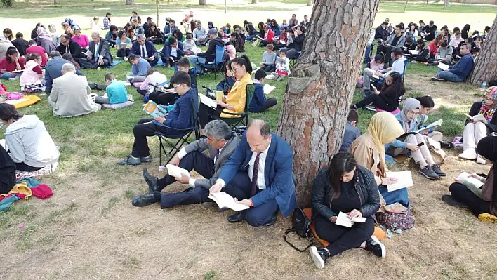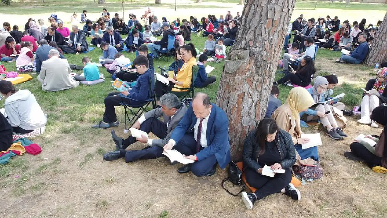 Park alanında bulunan çam ağaçlarının altında çimlerin üzerinde yarım saat süresince kitaplarını okuyan öğrenciler ve protokol üyeleri, kitap okumanın verdiği hazla birbirlerini kutladı.