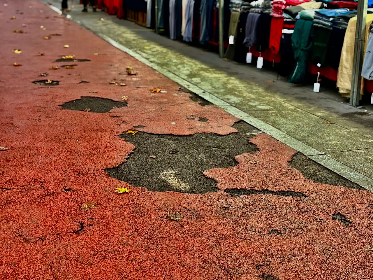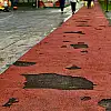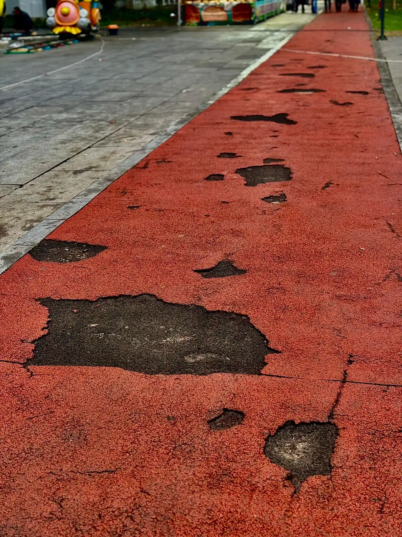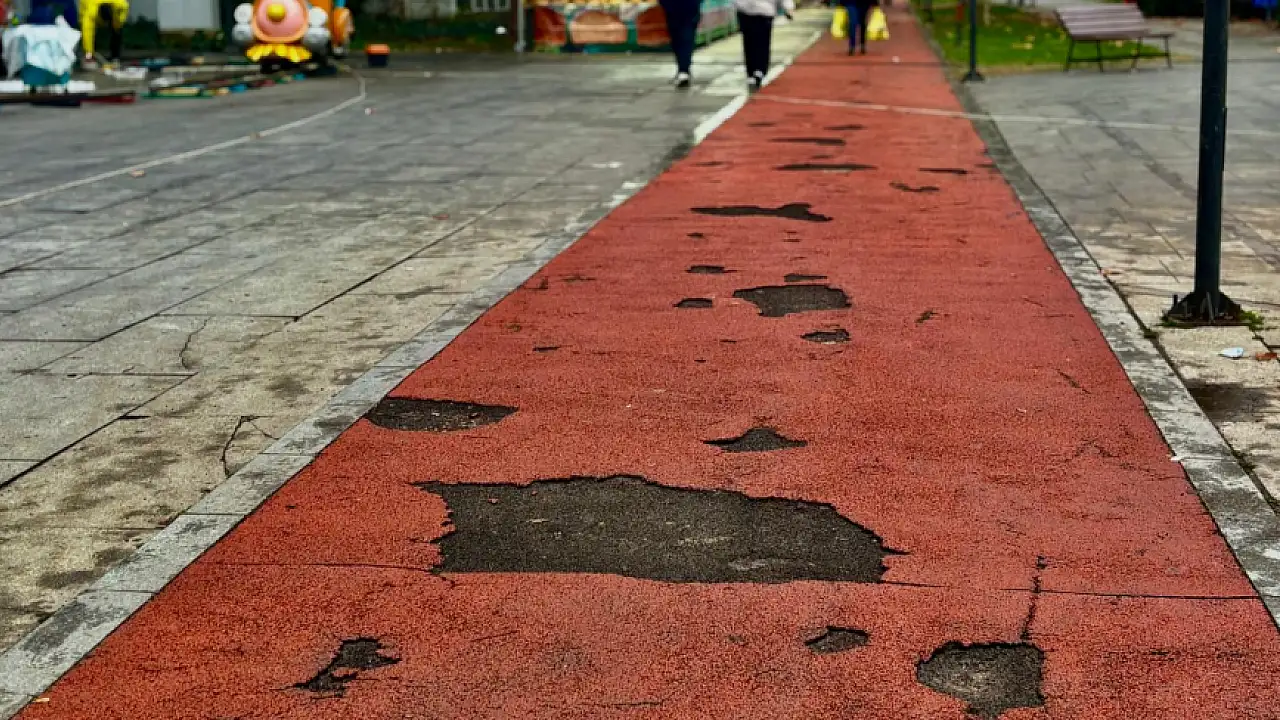zemin kaplamalarının yer yer söküldüğü, parçalandığı ve alt asfaltın ortaya çıktığı görülüyor. Kırmızı yürüyüş zemininin büyük bölümlerinde ciddi aşınma ve kopmalar oluşmuş durumda.