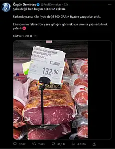 “Şaka değil ben bugün KENDİM çektim. Farkındaysanız Kilo fiyatı değil 100 GRAM fiyatını yazıyorlar artık. Ekonominin felaket bir yere gittiğini görmek için okuma yazma bilmek yeterli Kilosu 1320 TL !!!” yormunu yaptı.