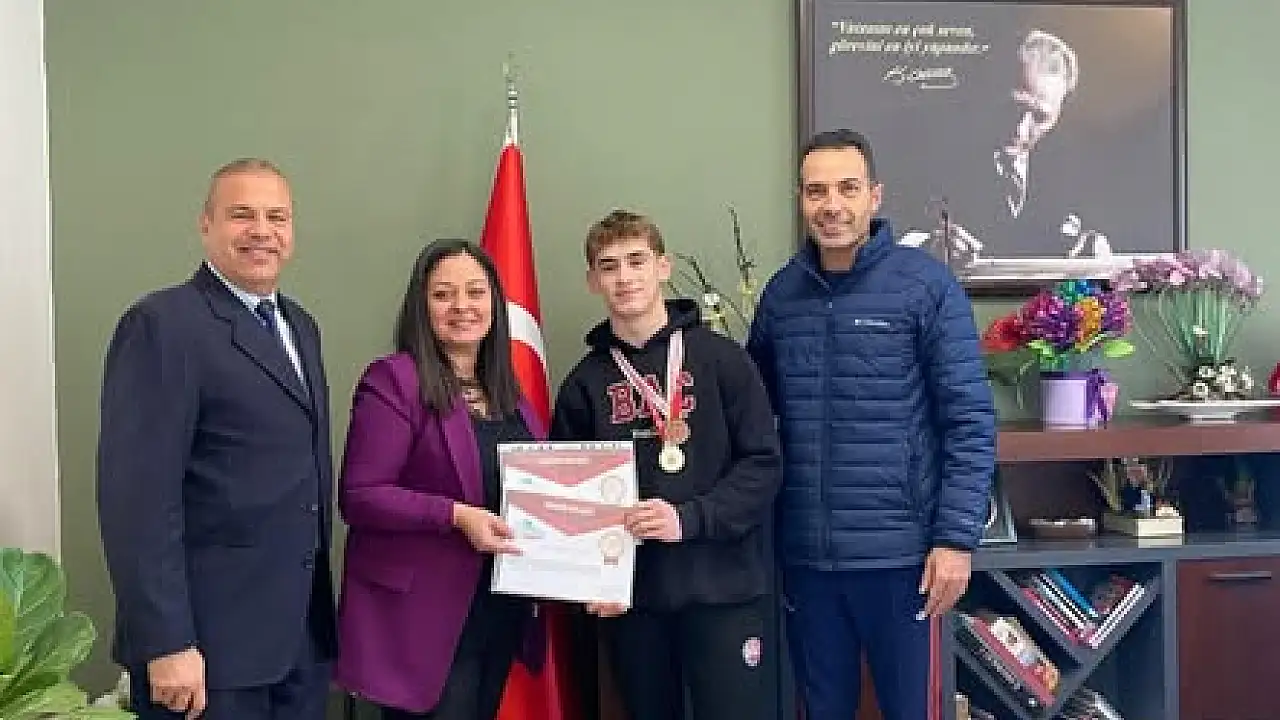 Cevat Çalışkan; öğretmeni ve okul yönetimiyle birlikte İlçe Millî Eğitim Müdürü Duygu Çevirgen Uzun’u ziyaret ederken, ziyarette öğrencinin başarısı takdirle karşılandı.