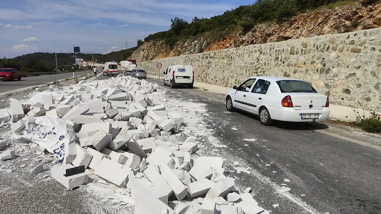 Kaza, Kuşadası-İzmir Karayolu üzerinde Kuştur mevkiinde saat 16.00 sıralarında meydana geldi. Edinilen bilgiye göre, Y.A. idaresindeki 35 BKN 378 plakalı tırın dorsesindeki kapaklar iddiaya göre, aşırı hız nedeniyle virajda açılarak içerisindeki gaz betonlar yola savurdu. Kazada tırın hemen arkasında seyreden 3 araçta maddi hasar meydana geldi. Kaza nedeniyle karayolu kısmi olarak trafiğe kapanırken, 112 Acil Çağrı Merkezi’ne yapılan ihbar üzerine bölgeye polis ekipleri sevk edildi.