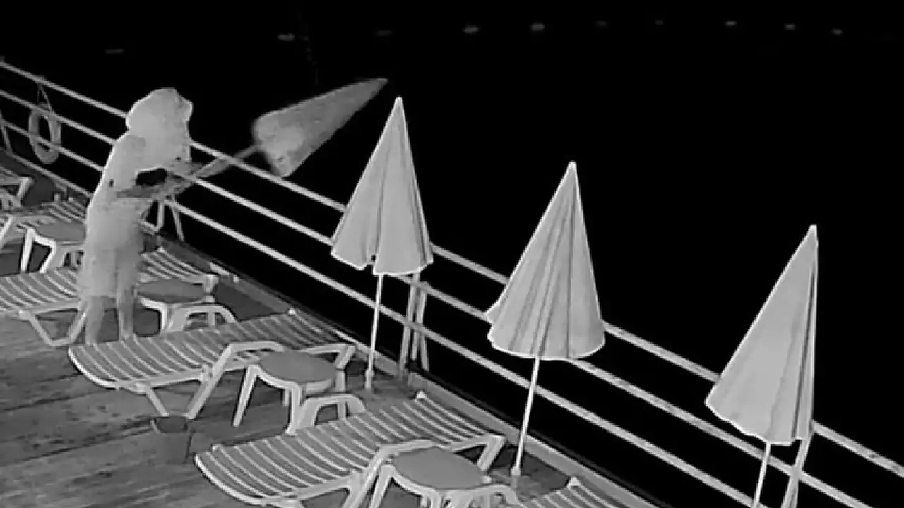 Antalya’nın Muratpaşa ilçesinde yüzünü havluyla kapatan kişinin, halk plajındaki şemsiyeleri denize attığı anlar kameraya yansıdı.Muratpaşa Belediyesinin işlettiği Konserve Koyu Falez Plajı’na gece gelen kişi, yüzünü havluyla kapatarak kameraya karşı bir süre dans etti. Ardından şezlongların yanındaki tüm şemsiyeleri falezlerden denize atan şüpheli, bölgeden ayrıldı.